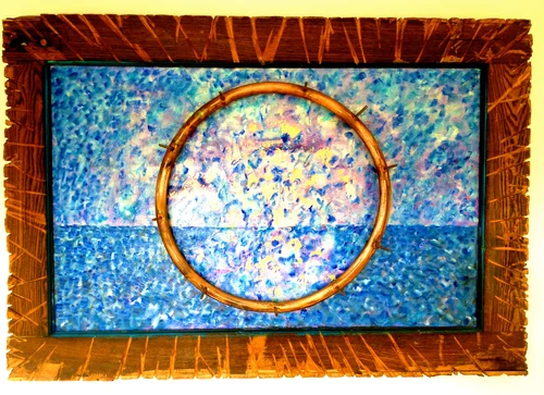 Oil paint in box frame with copper halo.