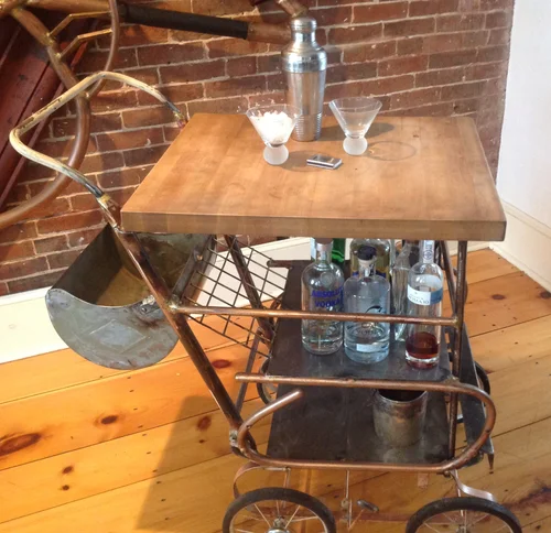 Butcher block with copper detailing on vintage, 1940's Hedstrom pram. Hand-forged ice bucket.